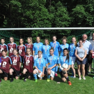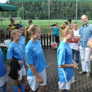 Auf dem Bild zu sehen sind: Spielerinnen sowie Trainer/-innen der U17 Juniorinnen des SV Hetzles und der SpVgg Reuth, Kreisjugendpflegerin Stefanie Schmitt, stellv. Landrat Otto Siebenhaar, Vorsitzender des KJR Forchheim Carl Shell, Ludwig K. Haas vom Gräfenberger Sportbündnis und Martin Mehl (2. Bürgermeister Neunkirchen am Brand)